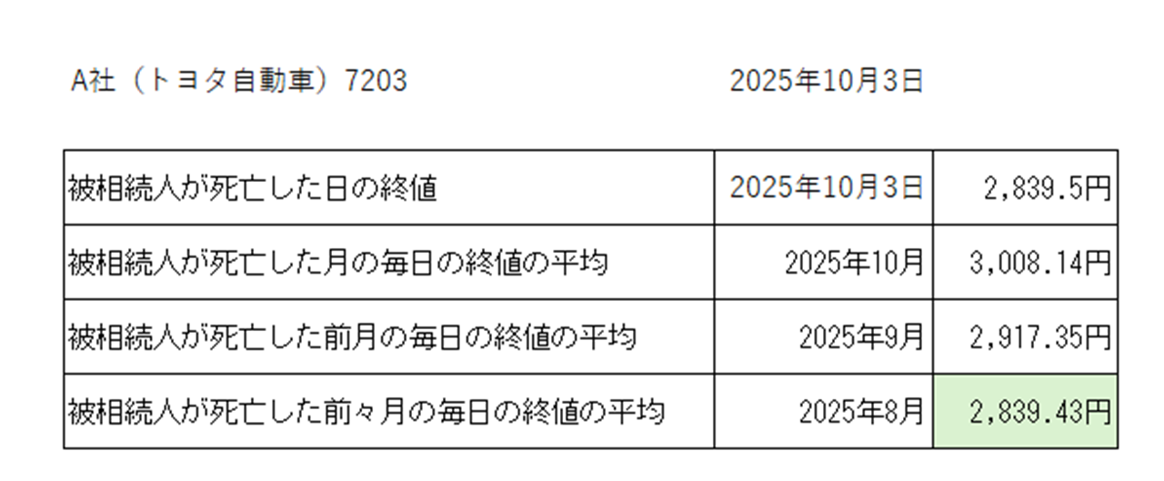 4つの価格の中では、被相続人が死亡した月の前々月(2025年8月)の毎日の終値の平均額が一番低いので、2,839.43円を評価額とすることができる。