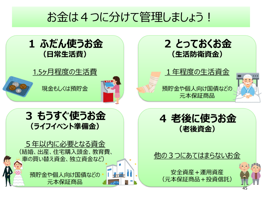 つまり、貯金をしつつも、ご自身のリスクに応じて投資にもお金を回して、お金を少しずつ4つの種類(①日常生活費~④老後資金)に分配していくイメージですね。現在投資をしている人は、こうした考え方を参考に投資金額を見直してみてはいかがでしょうか。