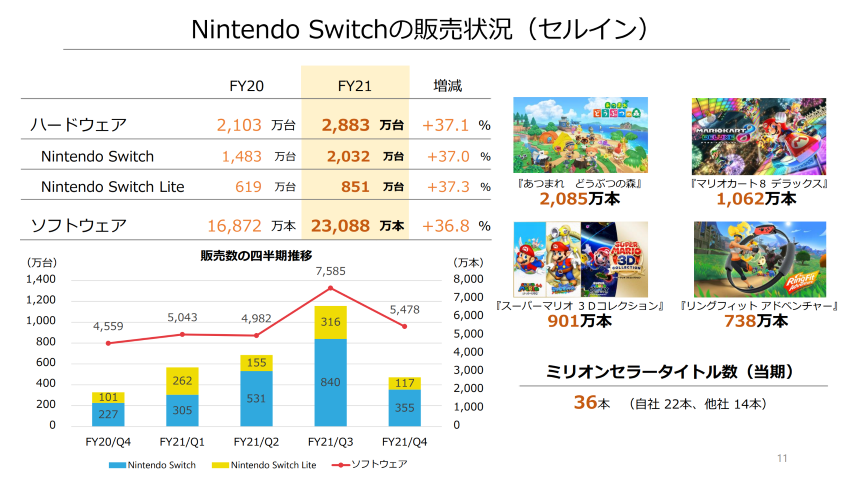 任天堂株式会社の決算説明資料の一部。Nintendo Switchの販売状況を確認できる