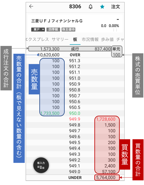 株式注文を出す際に、今の株価を知っているだけでは情報が足りません。なぜなら表示されている株価は基本的に最後に約定した価格であり、実際に売買できる価格なのか、いくらの数量(株数)なら売買できるかはまた別だからです。そこで、板情報をみることで、いまの売買情報を知ることができます。