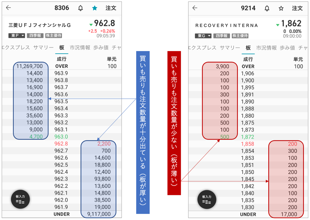 株式の注文は、買いたい人と売りたい人の株価と数量が合致することで約定することになります。しかし、どんな銘柄であっても必ず売り買いが成り立つとは限りません。売買が活発な銘柄なら心配することはありませんが、普段あまり売買がされていない銘柄であれば、買いたいと思っても売り手がいなくて買えなかったり、高値で売りたくても買い手がいないということもあります。例えば、10,000株の買い(売り)注文を出そうとしても、板を見て売り(買い)注文で10,000株以上の売数量が出ていなければ注文は成り立ちません(価格はわかれていても良い)。場合によっては、自分が出した注文によって株価が急激に変動してしまう可能性もあるので要注意です。