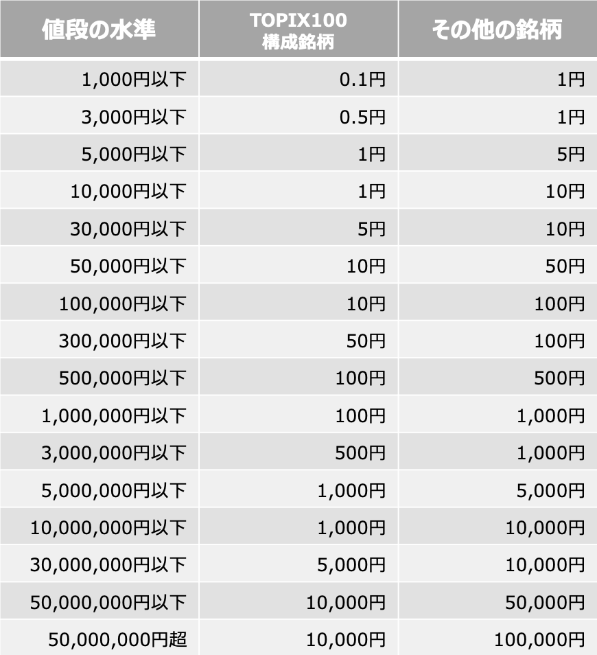 「呼値」とは、株式を売買する際の価格の刻み幅のことで、1株に対して注文できる最小の値幅(刻み値)です。呼値の幅はその銘柄の株価によってかわります。「呼値の単位」が以下の表のように決まっていますが、TOPIX100構成銘柄とその他銘柄によっても値幅は違うことがわかります。