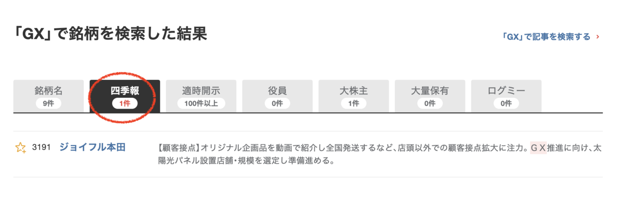 有料ではありますが、四季報オンラインを利用すれば、検索ワードで瞬時に検出されます。