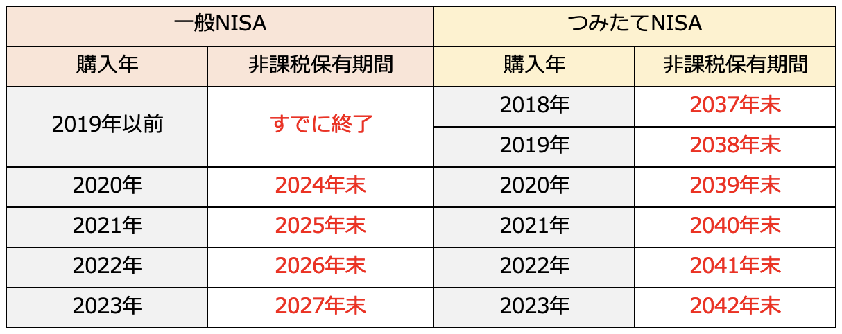 <旧NISAで購入した年と非課税保有期間が終了する年>