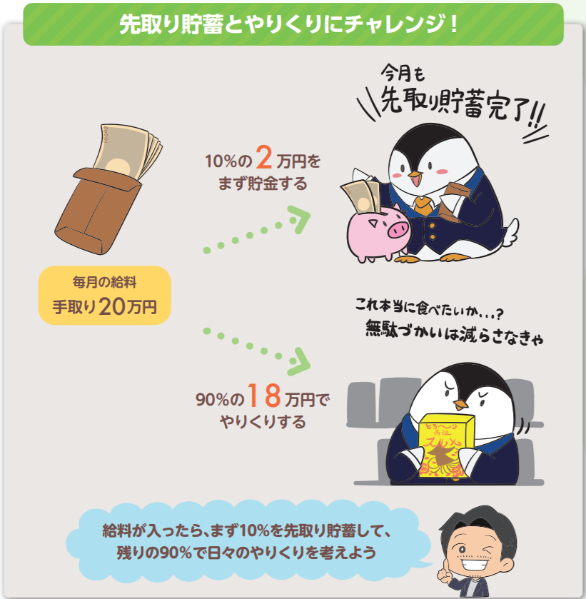 そして先取り貯蓄した上で、残りのお金でやりくりすることを考えましょう。強制的に使えるお金が制限されるので衝動買いが減って、本当にお金を払う価値があるかを自然と考えるようになりますよ。