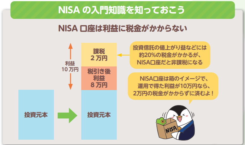 まとめると、NISA 口座という箱に株式や投資信託(様々な株式などが袋詰めになっている金融商品)などを入れて運用すると、利益に税金がかからないメリットがあると思えばいいでしょう。