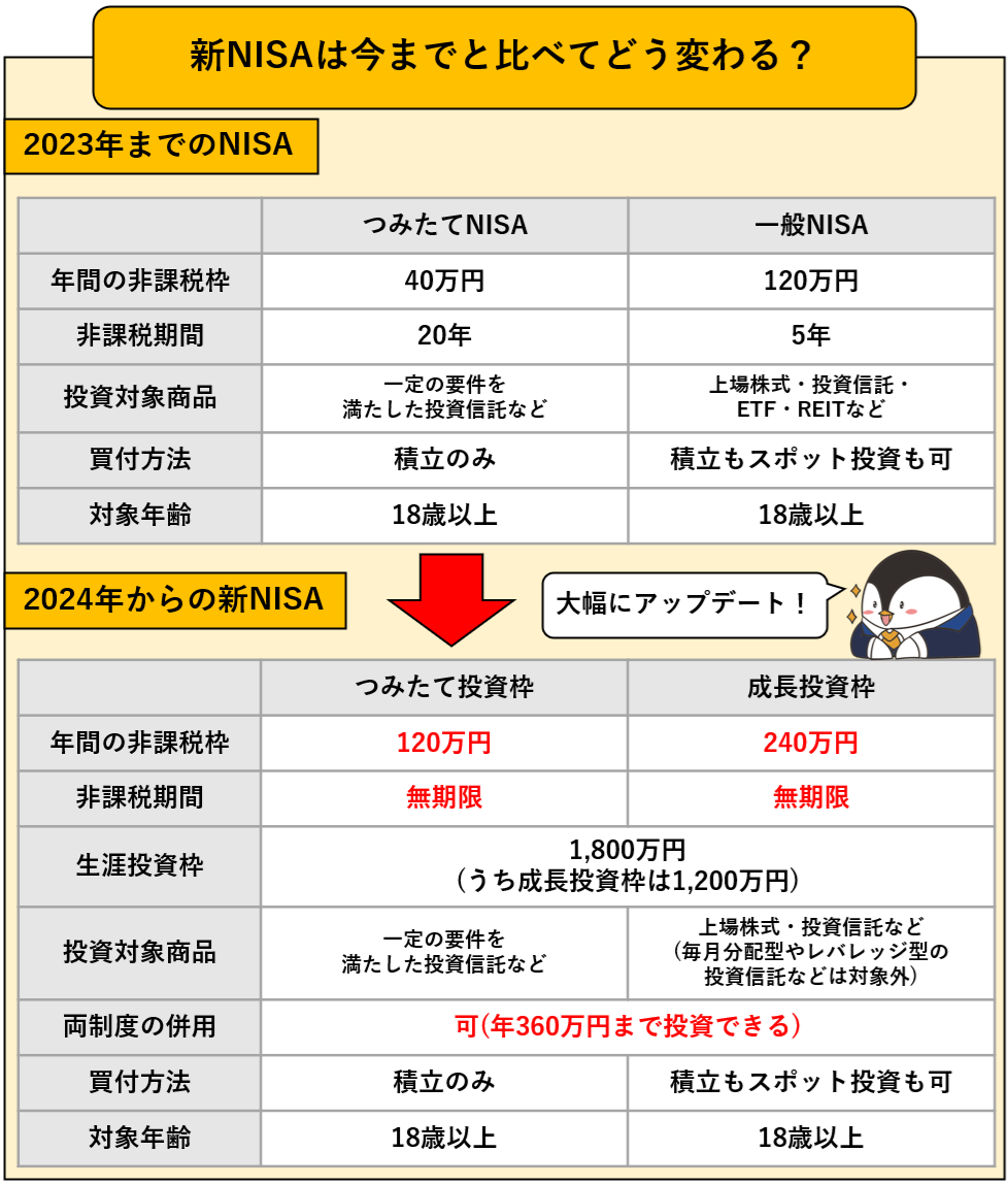 今までのつみたてNISAの非課税枠は年40万円でしたが、新NISAではつみたて投資枠と名称が変わり、年120万円に拡大しました。また、一般NISAの非課税枠は年120万円でしたが、こちらも新NISAでは成長投資枠と名称が変わり、年240万円に拡大しました。