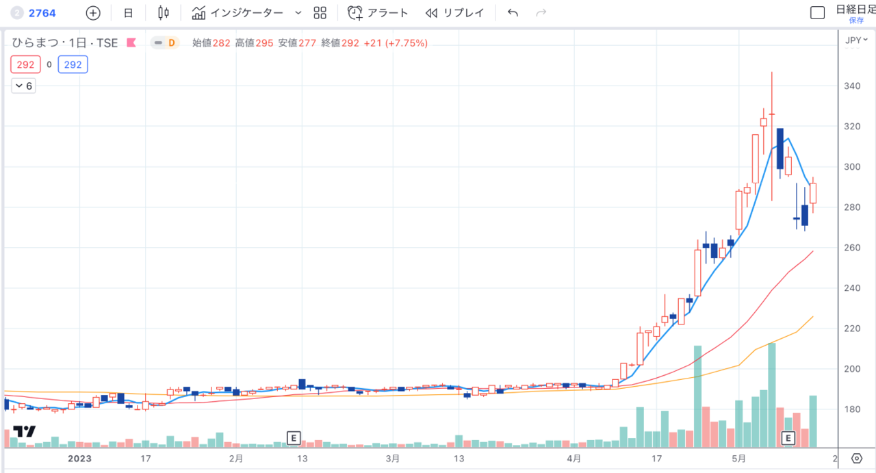 話は変わりますが、値上がり益をまったく期待せず、優待目的だけで保有していた銘柄が、気づくと1.5倍まで上昇していました。高級レストランやホテルを運営するひらまつ(2764)です。5月12日に2024年3月期の通期予想を発表。4期続いた赤字から、やっとの黒字転換見込みです。それを期待してか、決算発表前から株価はぐいぐい上昇。決算発表後はいったん株価が利益確定売りで下げましたが、5月16日に発表された4月の全社売上高は前年同月比25.8%増と好調が確認されたため、ふたたび株価は上昇しています。