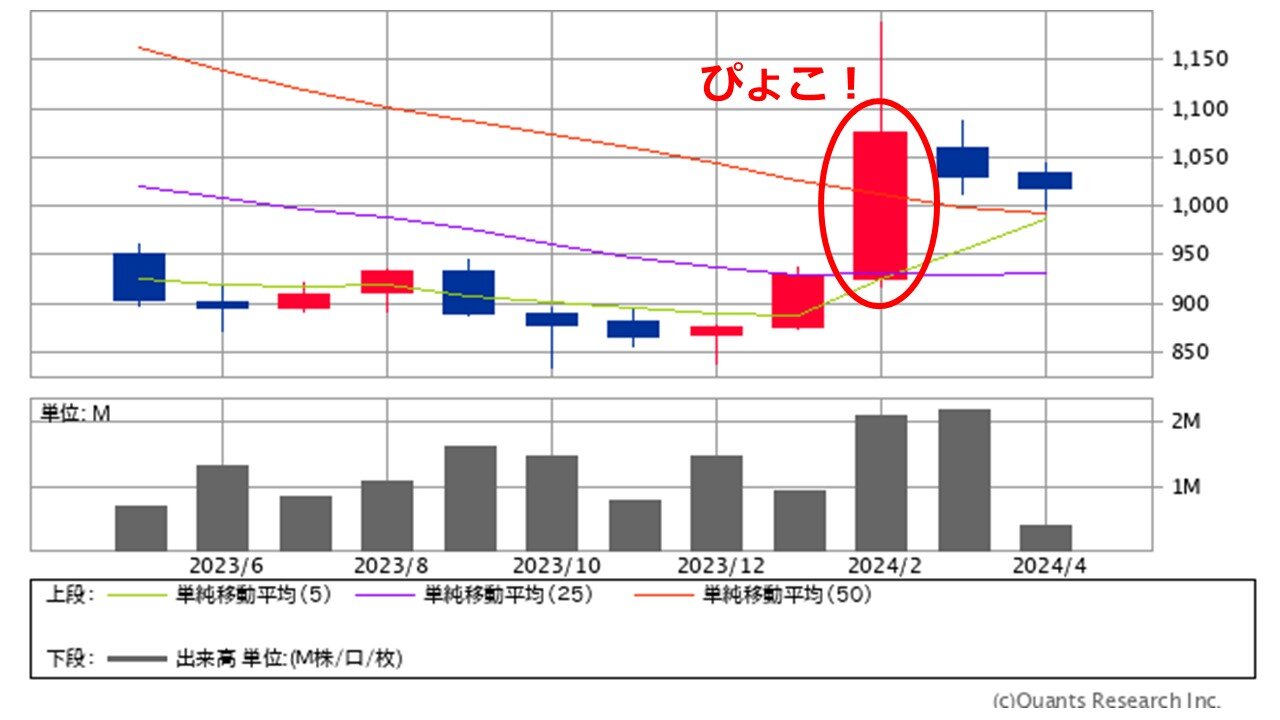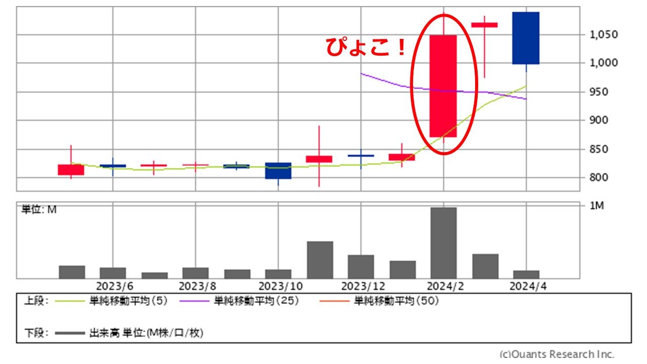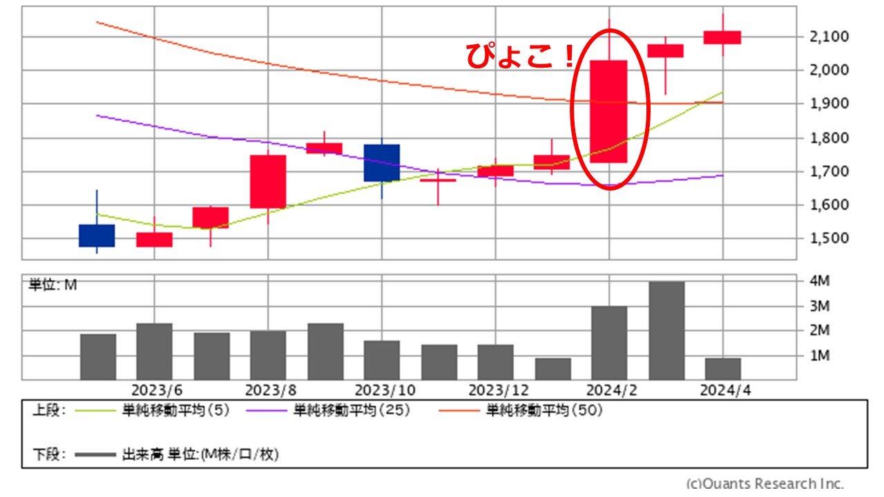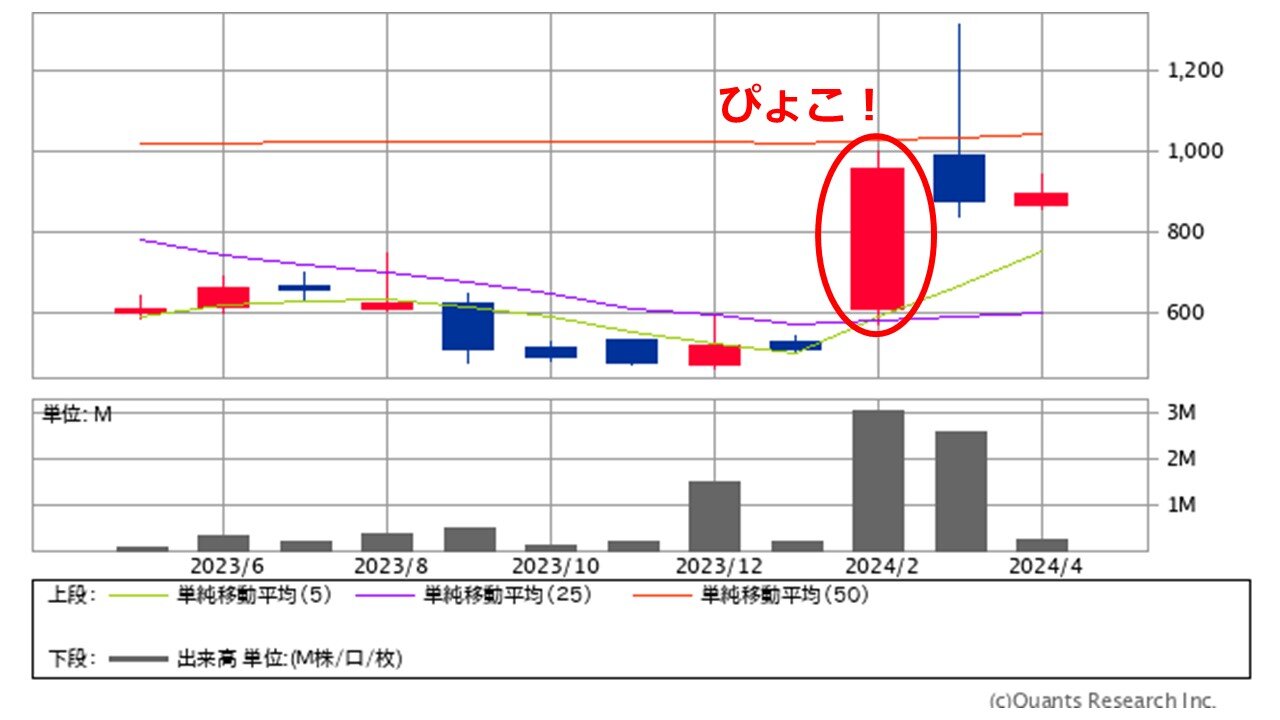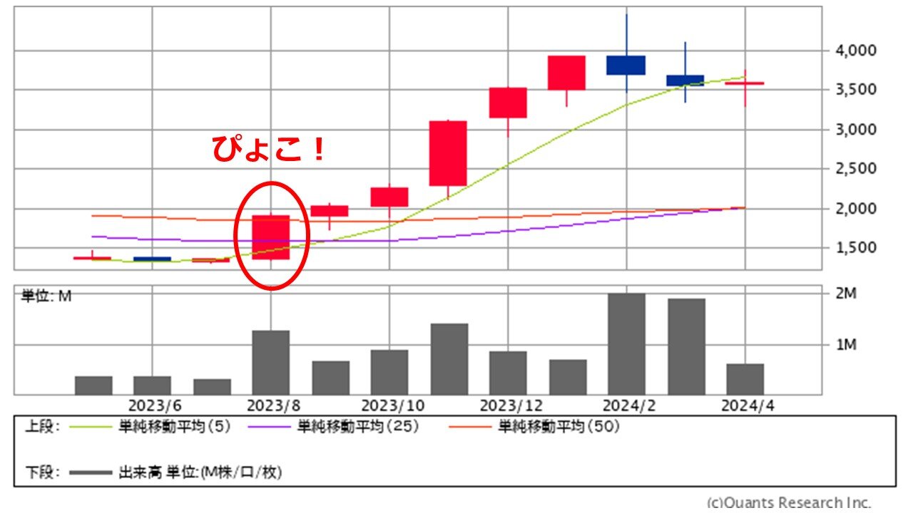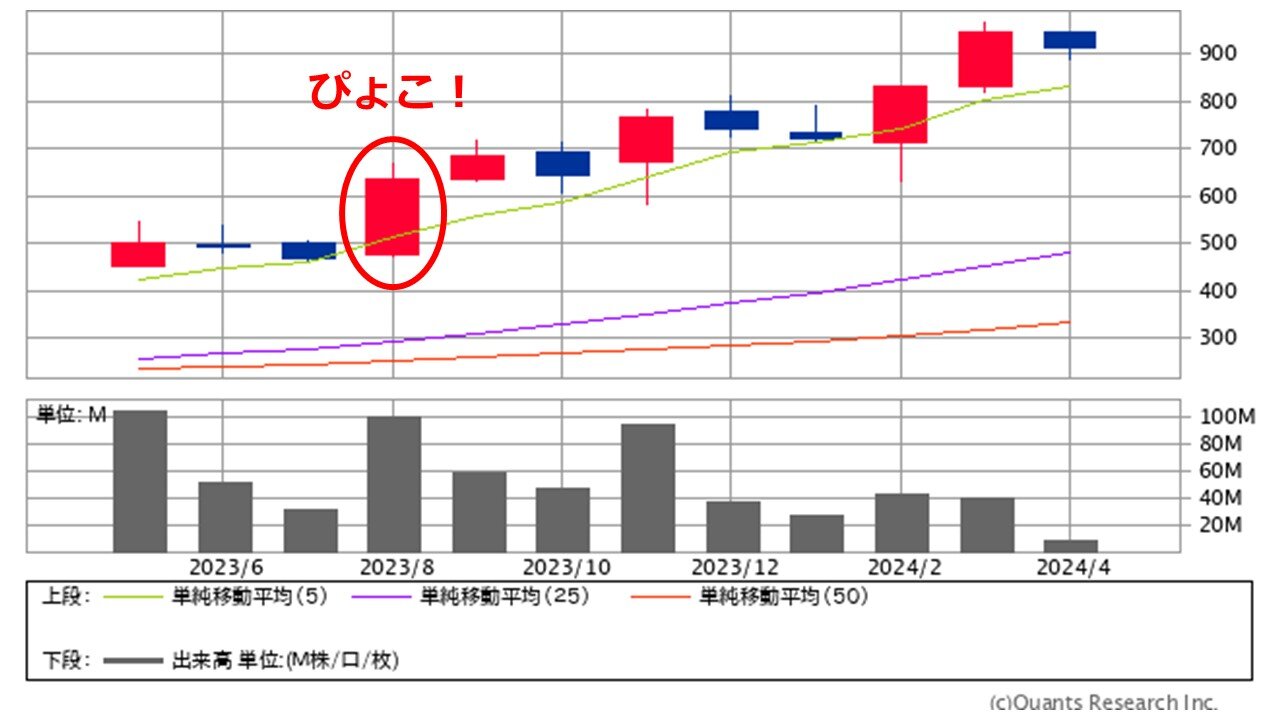 こんな風に「月足ぴょこ」が出たあとは株価が大きく上昇する銘柄もあります。