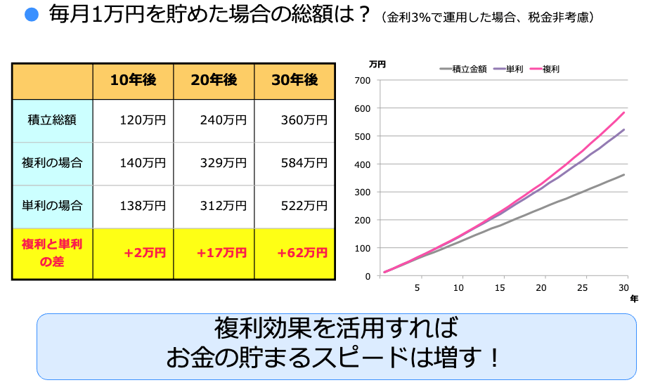 ※複利効果とは、運用で得られた収益を投資することで、運用金額が増え、その結果リターンも増えていく効果のこと