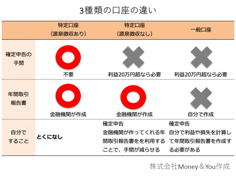 一般口座は、自分で年間の取引報告書を作成します。自分で1年の利益から税金の金額を計算し、確定申告を行い、納税までする必要があります。