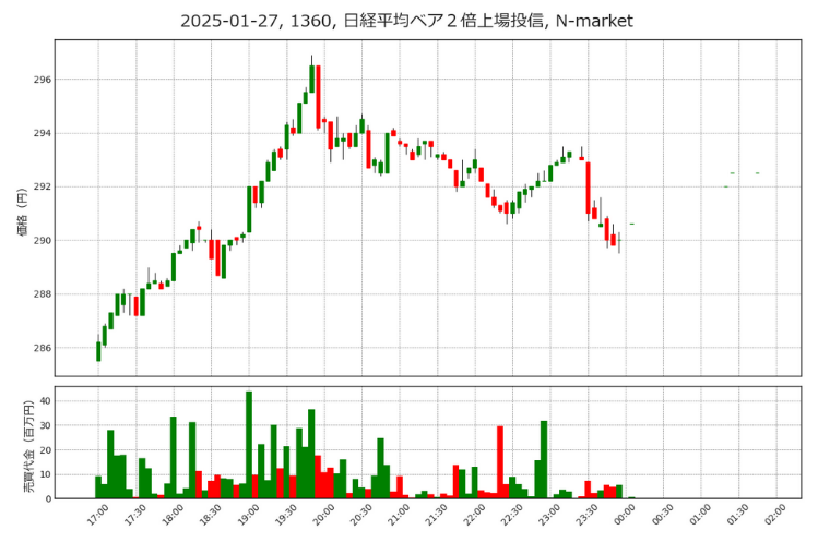 1月27日17:00〜18:00(日本時間)に、米国市場は「Deep Seekショック」でテック株が急落し始めました。これにより、東京の夜間取引に直結する日経先物にも売り圧が入り、日経レバ(1570)が下落。この時点で日経ダブルインバース(1357)や日経平均ベア2倍(1360)は、“ショック相場対策”として買いが集中し、価格が上昇し始めます。18:00 (日本時間)以降、米国のプレマーケットではVIXの急騰などを受けて更なるリスク警戒が生じ、日経先物やETFにおいて売りが加速。 日経レバ(1570)は値を崩し、日経ダブルインバース(1357)は底値から逆に買われて直近安値圏から値を伸ばす展開に。