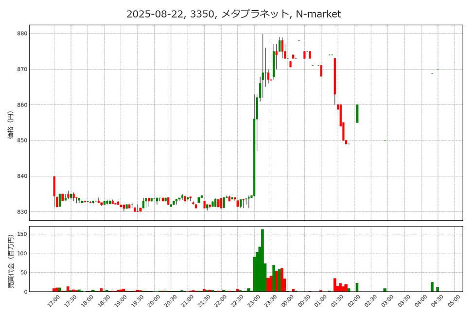 CAICAは従来の本業であったシステム開発で培ったノウハウを生かしブロックチェーン、暗号資産、Web3に展開してきた会社です。この時期は同社に対する評価が高まり、8月22日にストップ高、8月25日にも買い気配のままストップ高になりました。8月22日の夜間取引でCAICAは130~160円で取引されていましたが、8月25日の日中取引から参加した投資家は160円でしか買えなかった計算です。つまり、PTSの夜間取引が投資チャンスを広げたと言えます。この日のメタプラネットの夜間取引は当初830~840円近辺で推移していましたが、23時頃から880円に向けて急動意を示しています。ちなみに、メタプラネットの8月25日終値は904円であり、夜間から参加した投資家は利益を確保することができました。