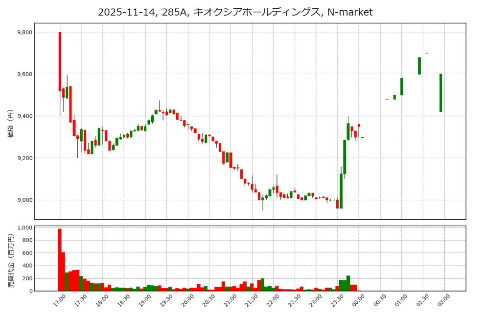 夜間取引ではおおよそ9,000円から9,800円の推移でした。ストップ安直後としては意外と底堅く強弱感が対立した展開でした。データセンターの増設でNAND型フラッシュメモリ市場への期待感もあり、押し目買いが入ったとみられます。11月17日の日中取引では9,895円~11,165円(前日比1,140円高)の展開でした。夜間取引での押し目買いは奏功した可能性が大きいようです。