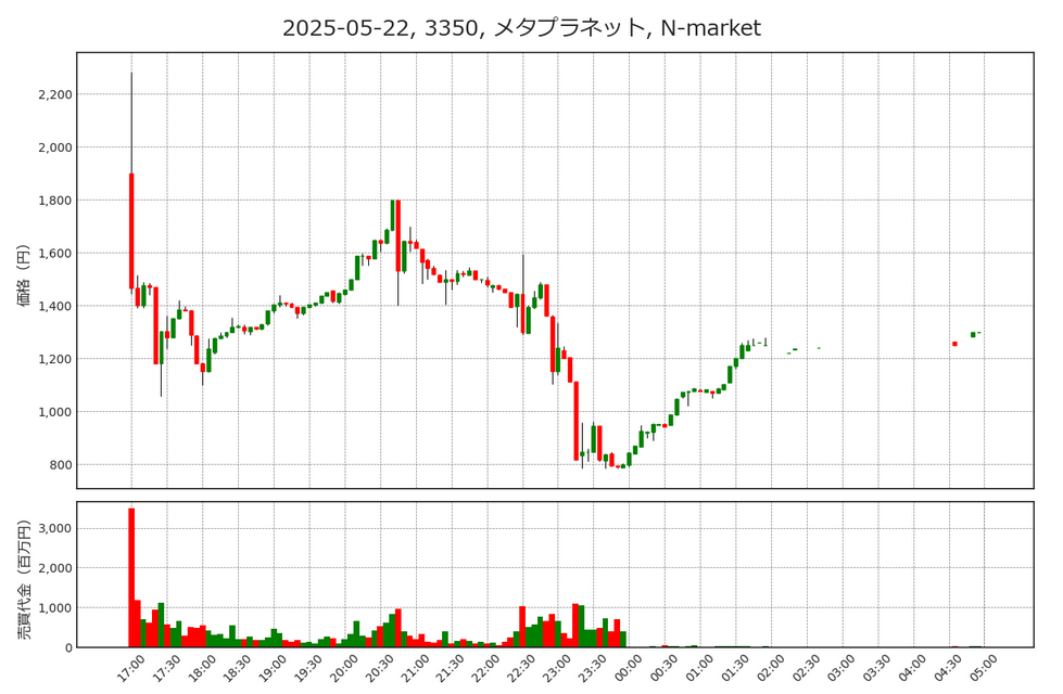 こうした中、代表的な暗号資産関連銘柄であるメタプラネットは5月22日まで3日連続ストップ高となりました。買いが多く5月22日は買い気配が切りあがったため、買い注文を残す形になりました。この日の夜間取引ではチャートにもあるように、メタプラネットは22日の終値から大きく乖離した価格帯での取引となりました。ここで注意すべき点は4点です。
