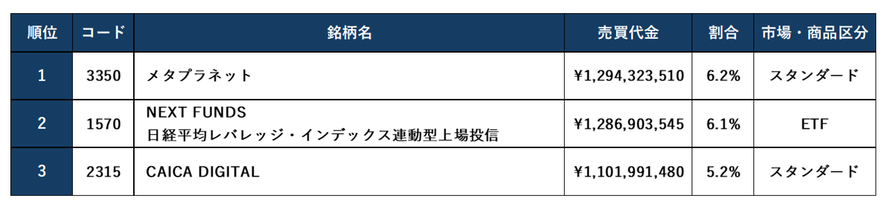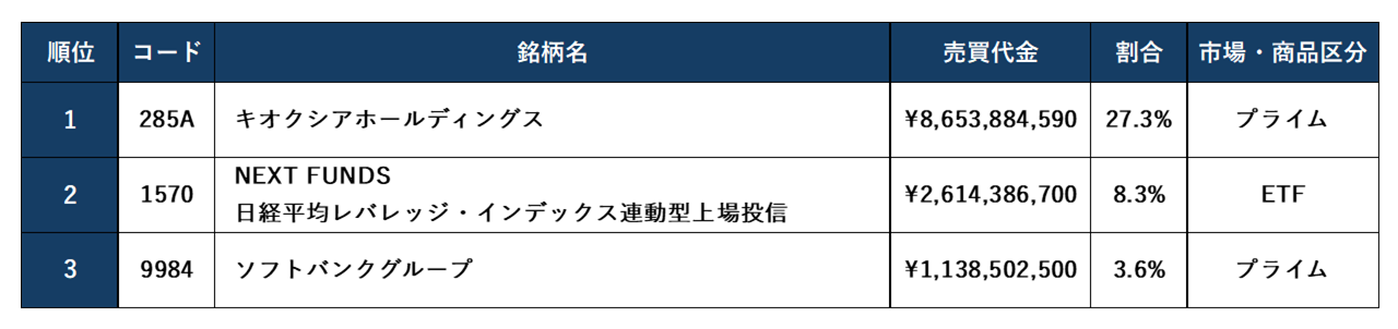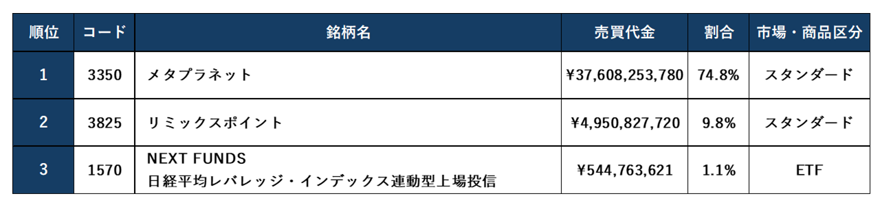 第2四半期(4月~ 6月) 第1位 5月22日(木)夜間の売買代金:502億円
