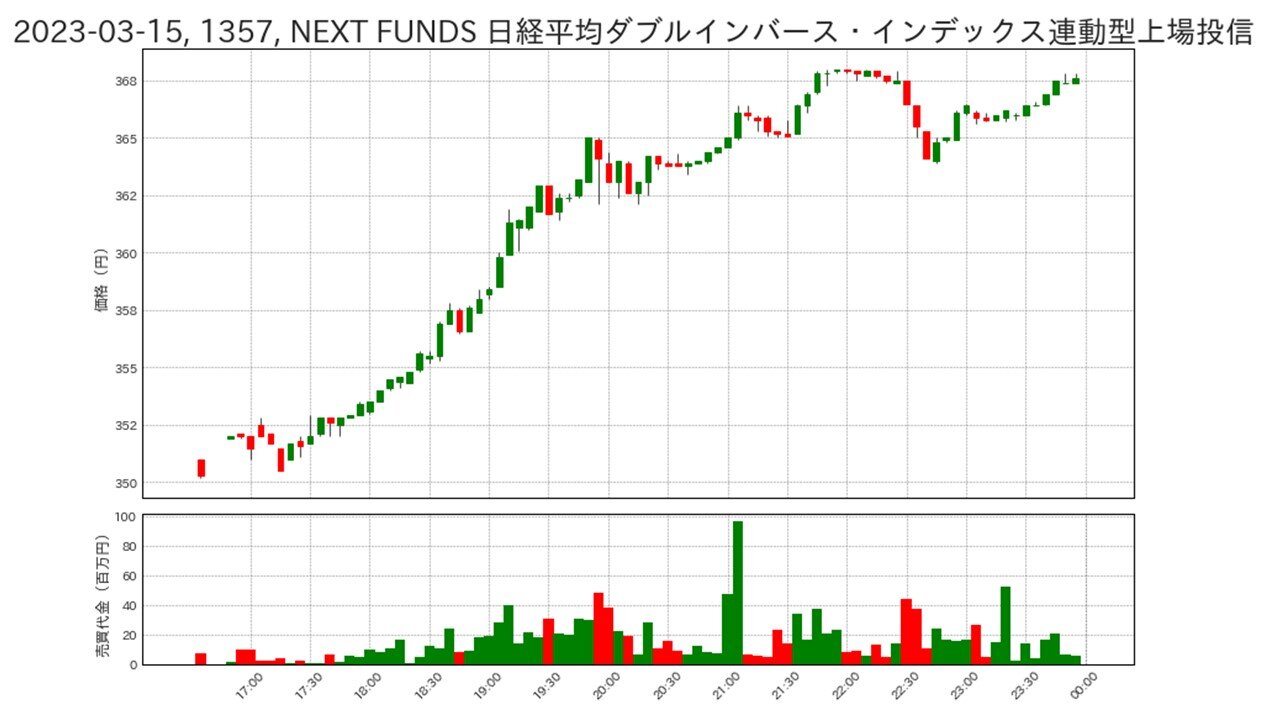 3月月間では、SBI証券の「売買代金上位」として日経平均レバレッジ・インデックス(1570)は第2位ですが、日経平均ダブル・インバース(1357)は10位以内に入っていません。しかし、15日の夜間取引では日経平均ダブル・インバースが第2位になっており、機敏に動いた投資家が増えたことがわかります。なお、図にあるように15日夜間の日経平均レバレッジ・インデックスは概ね350円から368円程度の価格帯で推移していましたが、翌日の東京株式市場の価格帯は357円~369円であり、前日夜間に先行して織り込みが進んでいた形になっています。