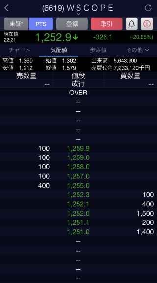 もともとダブルスコープは、個人投資家さんからの人気も高く、SNSでもよく見かける視聴率の高い銘柄です。それゆえに流動性も高く、デイトレード向きではありますが、わたしはデイトレをまったくしませんし、人気が高い銘柄は、ボラティリティーも高くなりがちですので、敬遠しておりました。しかし、ここでふと「夜間取引はどうなってるのだろう?」と好奇心がムクムクと湧き上がり、二営業日連続ストップ安になった9月21日(水)の夜間に板状況を確認。そこには、今まで見たことないほど厚みのある注文が並んでいました!