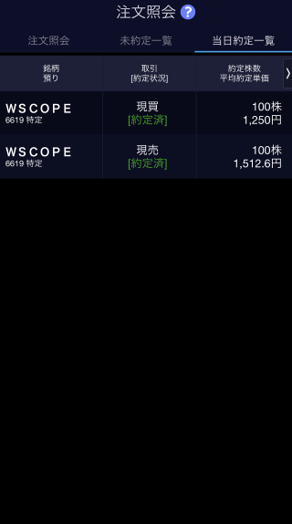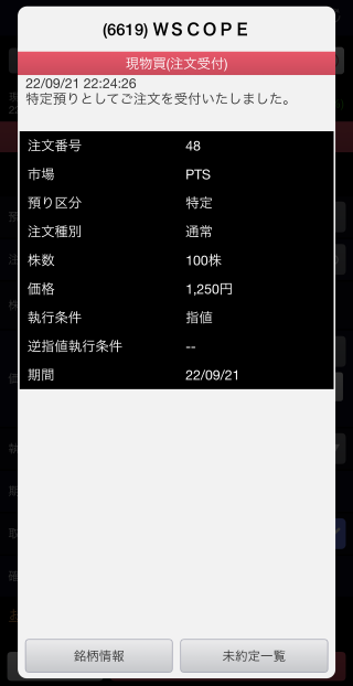 株価は、日中の終値1,579円からみるとかなり安くなっております。ここはひとつ、損失覚悟で買ってみようか?わたしの投資魂が、こんな好機を見逃すことを許しませんでした。買い板に出されている注文のいちばん安い金額よりさらに下の1,250円で指し値注文を発動。ドキドキしつつ寝る準備をしていたら、注文を出してから20分ほどで約定のお知らせが!