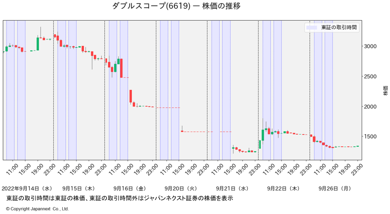 通常、東京証券取引所やPTSでは、一日の売買における値動きの幅を価格水準に応じて一定に制限しており、この値幅を制限値幅といいます。2日連続ストップ安が続くと3日目は、この制限値幅が4倍に拡大されます。ダブル・スコープの9月21日(水)の終値は1,579円。株価1,500円以上2,000円未満の制限値幅は400円ですから、9月22日(木)の制限値幅は4倍の1,600円となります。株価が1,579円なので、1,600円下げたらゼロ円となりますが、この場合は、1円が下限となります。